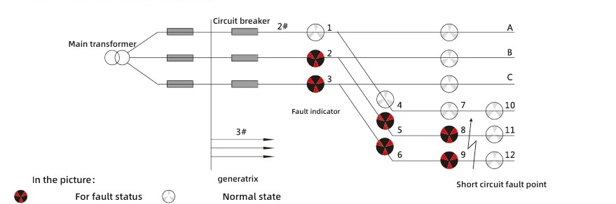 Pe baza caracteristicilor defectelor de scurtcircuit, criteriul de acțiune este schimbarea bruscă a curentului însoțită de întreruperea de curent a dispozitivului de protecție. Logica de interpretare a diagramei de indicare a defecțiunii este următoarea: dacă indicatorii 2, 5 și 8 ai fazei A și indicatorii 3, 6 și 9 ai fazei C a liniei 2 devin roșii, în timp ce indicatorii 11 și 12 rămân albi, atunci se poate determina că a apărut o defecțiune de scurtcircuit la acel punct al liniei de ieșire.